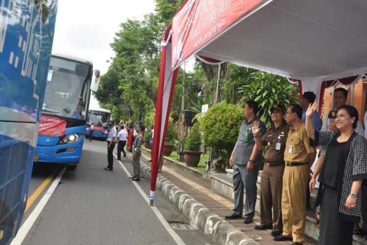 Merdeka.com, Tabanan - Bupati Tabanan, Ni Putu Eka Wiryastuti melepas keberangkatan 12 armada rombongan mudik gratis ke sejumlah daerah tujuan di Pulau Jawa, Senin (19/6). Yang didominasi daerah Jawa Timur, yakni, Surabaya, Malang, Jember dan Banyuwangi.