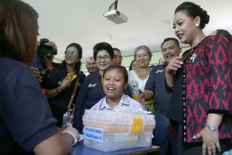 Selain memberikan kuis, Menteri Nila dan Bupati Eka juga sempat meninjau pemberian imunisasi bagi para siswa yang berlangsung di dalam satu ruang kelas.