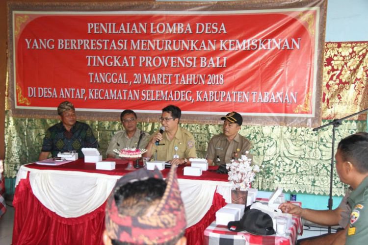 Merdeka.com, Tabanan - Desa Antap di Kecamatan Selemadeg, Kabupaten Tabanan dipercaya sebagai duta Kabupaten Tabanan dalam lomba desa berprestasi menurunkan kemiskinan tingkat provinsi. Terkait prestasi tersebut, Desa Antap dinilai oleh Tim Provinsi Bali, Selasa (20/3) di Kantor Desa Antap.