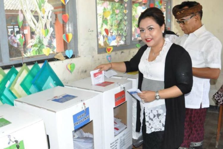 Merdeka.com, Tabanan - Bupati Tabanan Ni Putu Eka Wiryastuti didampingi Ketua DPRD Provinsi Bali N.Adi Wiryatama beserta keluarga, menggunakan hak pilihnya di TPS 15, dalam Pemilu serentak 2019 di Banjar Tegeh, Desa Angseri, Baturiti, Rabu, (17/4) pagi yang bertempat di SD N 2 Angseri.