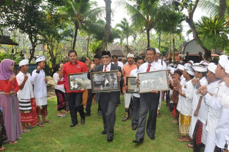 menyerahkan kata-kata mutiara Bung Karno ke sejumlah sekolah yang ada di Tabanan, Jumat (9/6). Sekolah yang dikunjungi antara lain SD 5 Kediri, SD 2 Batanyuh dan SMPN 1 Tabanan. Turut hadir mendampingi Wabup Sanjaya dalam kunjungannya Kepala Dinas Pendidikan I Wayan Adnyana, Anggota DPRD Kabupaten Tabanan dan Camat setempat.